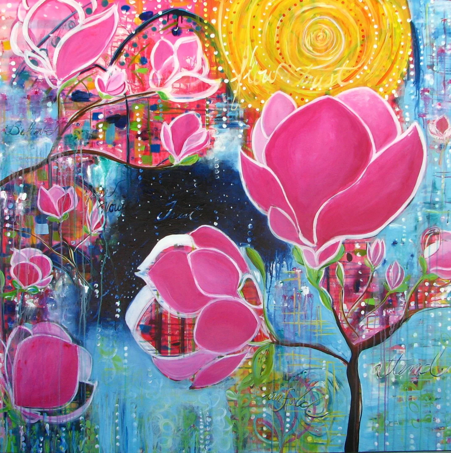 You'll see words in it like "unfold," "attend," "flow," "trust," "your voice matters," "your story matters," and "Believe." All words that I needed to heal and free myself and all representing the very real healing, liberating, creative, loving energies that I experienced when creating this painting and that I know flowed into it.
